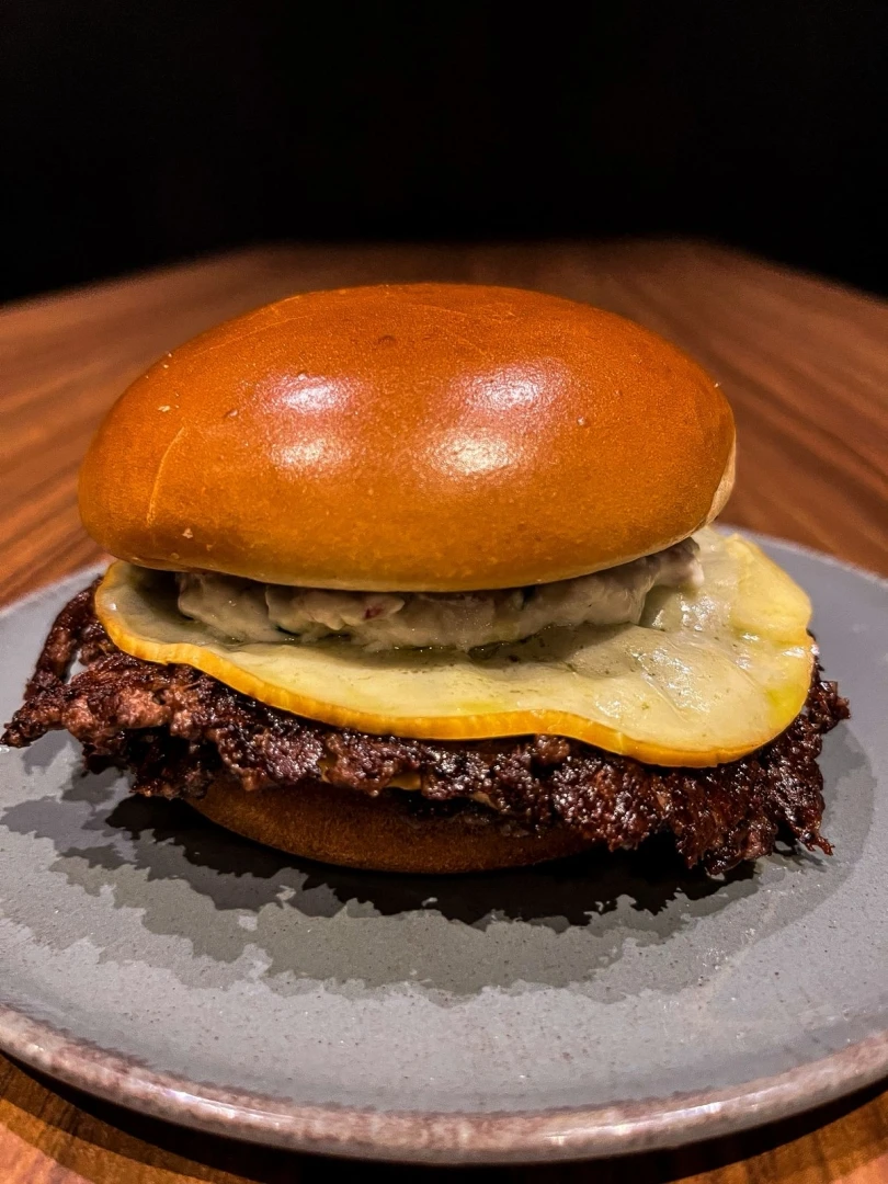 Pão de brioche, 2 smashes de 70g, cheddar, cebola chapeada e maionese de hondashi.